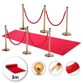 Σετ με 6 διαχωριστικά κολωνάκια χρυσά με σφαίρα στην κορυφή, 4 κόκκινα βελούδινα σχοινιά 1.5m και 1 κόκκινο χαλί 3m