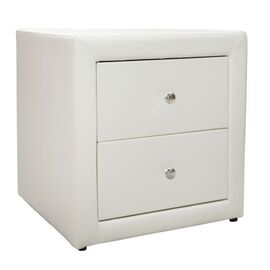 Κομοδίνο επενδυμένο με τεχνόδερμα, σε λευκό χρώμα. Το κομοδίνο έχει 2 συρτάρια αποθήκευσης τα οποία ανοίγουν με πόμολα χρωμίου. Διαστάσεις κομοδίνου: 48X41X50 εκ Παρατηρησεις: 1)Το κομοδίνο διατίθεται σε πακέτο αμοντάριστο.