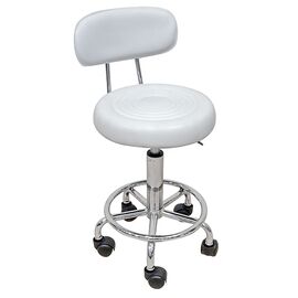 BAR72 σκαμπό τροχήλατο με πλάτη και αμορτισέρ κατάλληλο για πολύωρη χρήση σε σχεδιαστήρια/ταμεία. Έχει πόδι και υποπόδιο χρωμίου για καλύτερη στήριξη του ποδιού. Το κάθισμα και η πλάτη είναι ενδεδυμένα με λευκό χρώμα PU.