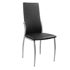 Καρέκλα τραπεζαρίας από σκελετό χρωμίου και επένδυση από δερματίνη σε μαύρο χρώμα.Συνδιάστε την με γυάλινο τραπέζι και φτιάξτε ένα υπέροχο σετ τραπεζαρία για την κουζίνα σας.Η καρέκλα διατίθεται έτοιμη μονταρισμένη. Διαστάσεις: 40x44x83 cm ΠΡΟΣΟΧΗ: Το προϊόν διατίθεται αμοντάριστο σε πακέτο