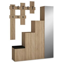 Έπιπλο εισόδου σε απόχρωση sonama. Είναι κατασκευασμένο από μελαμίνη πάχους 18mm. Διαθέτει πέντε κρεμάστρες, δύο ανοικτές επιφάνειες - ράφια και ένα ντουλάπι με δύο ράφια στο εσωτερικό του για να αποθηκεύσετε με ευκολία τα προσωπικά σας αντικείμενα. Μια value for money πρόταση για έπιπλο εισόδου...