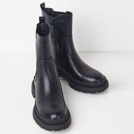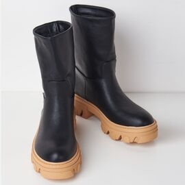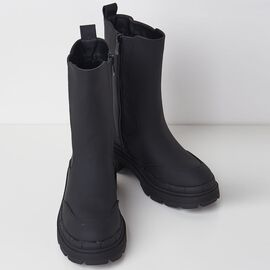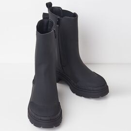 Μποτάκι από leather look υλικό με στρογγυλή ανάγλυφη μύτη από καουτσούκ. Ελαστικό πλαϊνό τμήμα. Θηλάκι στην κορυφή. Τρακετρωτή σόλα με ανάγλυφο σχέδιο. Κλείνει με φερμουάρ. Συνολικό ύψος : 24,5 εκ. Ύψος σόλας : 3,5 εκ.