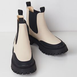 Leather look μποτάκι με ελαστικό πλαϊνό μέρος. Διπλό θηλάκι στην κορυφή. Τρακτερωτή chunky σόλα σε χρωματική αντίθεση με wavy σχέδιo. Κλείνει με φερμουάρ. Συνολικό ύψος : 28,5 εκ. Ύψος σόλας : 5 εκ.