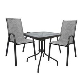 ΤΟ ΣΕΤ ΠΕΡΙΛΑΜΒΑΝΕΙ Ένα τραπέζι μεταλλικό εξωτερικού χώρου σε χρώμα γκρι-ανθρακί, με ενσωματωμένο τζαμί ασφάλειας (secure). Διαστ. Τραπεζιού: 60x60x72 εκ. Δύο πολυθρόνες εξωτερικού χώρου από μεταλλικό σκελετό σε γκρι χρώμα με textilene 2x1 μεγάλης αντοχής σε ήλιο και βροχή. Διαστ. Καρέκλας:...