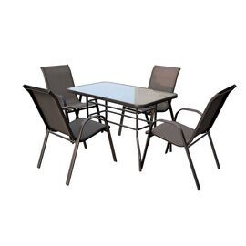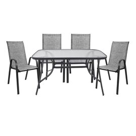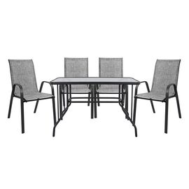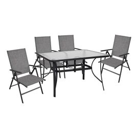ΤΟ ΣΕΤ ΠΕΡΙΛΑΜΒΑΝΕΙ Ένα τραπέζι τραπεζαρίας BRUNO κατασκευασμένο από μεταλλικό σκελετό σε γκρι απόχρωση, με ενσωματωμένο τζάμι ασφαλείας (secure). Διαστάσεις: 140x80x72Y εκ. Τέσσερις πτυσσόμενες πολυθρόνες κατασκευασμένες από μεταλλικό σκελετό, επενδυμένες με ύφασμα textilene σε γκρι απόχρωση....