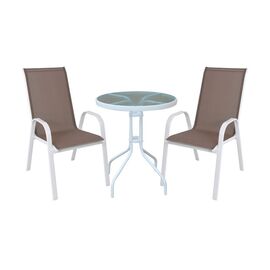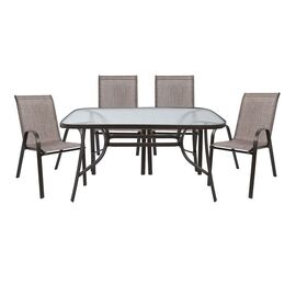 ΤΟ ΣΕΤ ΠΕΡΙΛΑΜΒΑΝΕΙ Ένα τραπέζι τραπεζαρίας BRUNO κατασκευασμένο από μεταλλικό σκελετό σε καφέ απόχρωση, με ενσωματωμένο τζάμι ασφαλείας (secure). Διαστάσεις: 140x80x72Y εκ. Τέσσερις πτυσσόμενες πολυθρόνες κατασκευασμένες από μεταλλικό σκελετό, επενδυμένες με ύφασμα textilene σε καφέ απόχρωση....