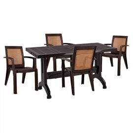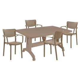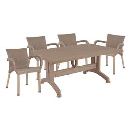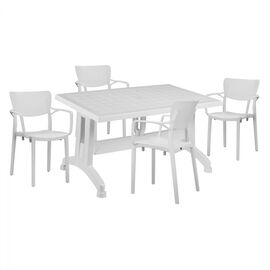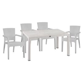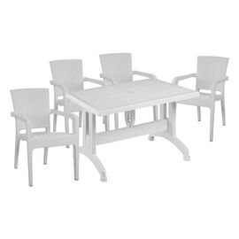 ΤΟ ΣΕΤ ΠΕΡΙΛΑΜΒΑΝΕΙ Ένα τραπέζι πολυπροπυλενίου εξωτερικού χώρου σε λευκή απόχρωση με rattan λεπτομέρειες περιμετρικά της επιφάνειας. Διαθέτει UV protection για μεγαλύτερη προστασία από τον ήλιο. Διαστ. Τραπεζιού: 150x90x73,5Υ εκ. Τέσσερις πολυθρόνες εξωτερικού χώρου με μπράτσα από πολυπροπυλένιο...