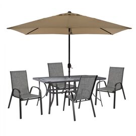 Σετ τραπεζαρίας 6 θέσεων με ομπρέλα. ΤΟ ΣΕΤ ΠΕΡΙΛΑΜΒΑΝΕΙ Ένα τραπέζι τραπεζαρίας μεταλλικό εξωτερικού χώρου σε γκρι απόχρωση με ενσωματωμένο τζάμι ασφαλείας (secure). Διαθέτει μια τρύπα στο κέντρο για την τοποθέτηση ομπρέλας. Διαστάσεις Τραπεζιού: 150x 90x75 εκ. Χρώμα: Γκρι Τέσσερις μοντέρνες...