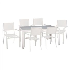 Σετ τραπεζαρίας 6 θέσεων. ΤΟ ΣΕΤ ΠΕΡΙΛΑΜΒΑΝΕΙ Ένα τραπέζι τραπεζαρίας εξωτερικού χώρου σε λευκή του πάγου απόχρωση με γυαλί στην επιφάνειά του. Είναι ανθεκτικό καθώς είναι κατασκευασμένο από μέταλλο και αυτό το καθιστά κατάλληλο για χρήση σε εσωτερικούς αλλά και εξωτερικούς χώρους. Διαστάσεις:...