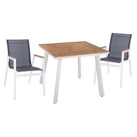 ΤΟ ΣΕΤ ΠΕΡΙΛΑΜΒΑΝΕΙ Ένα τραπέζι κατασκευασμένο από σκελετό αλουμινίου σε ανθρακί απόχρωση και επιφάνεια Polywood σε φυσική απόχρωση ξύλου. Διαστάσεις: 80x80x73 εκ. Δύο καρέκλες αλουμινίου, επαγγελματικών προδιαγραφών σε γκρι απόχρωση. Διαστάσεις: 45,5x59x83,5 εκ. Ύψος καθίσματος: 44,5 εκ.