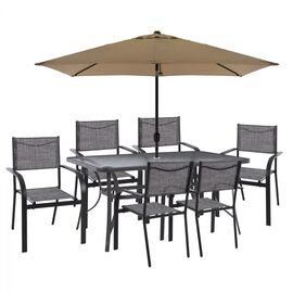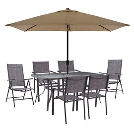 Σετ τραπεζαρίας 6 θέσεων με ομπρέλα. ΤΟ ΣΕΤ ΠΕΡΙΛΑΜΒΑΝΕΙ Ένα τραπέζι τραπεζαρίας εξωτερικού χώρου σε σε γκρι απόχρωση με ενσωματωμένο τζάμι ασφαλείας (secure). Διαθέτει μια τρύπα στο κέντρο για την τοποθέτηση ομπρέλας. Είναι ανθεκτικό καθώς είναι κατασκευασμένο από μέταλλο και αυτό το καθιστά...