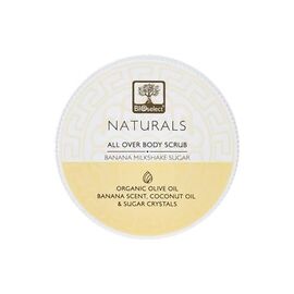 Bioselect naturals πήλινγκ σώματος banana milkshake sugar με βιολογικό λάδι ελιάς, άρωμα μπανάνας, λάδι καρύδας και κρυστάλλους ζάχαρης.