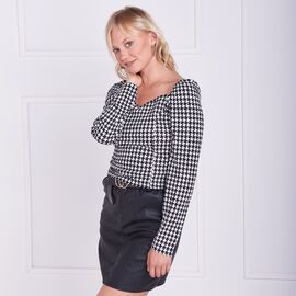 Τοπ με ασπρόμαυρο πιε ντε πουλ μοτίβο με ελαστικότητα. Τετράγωνο κόψιμο στο λαιμό με ελαστικούς ώμους.
