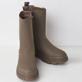 Μποτάκι αδιάβροχο με σόλα από καουτσούκ. Απλό σχέδιο με εξωτερικές ραφές που δημιουργούν ανάγλυφα τμήματα. Θηλάκι στην κορυφή. Κλείνει στο πλάι με φερμουάρ. Συνολικό ύψος : 25,5 εκ. Σόλα : 4 εκ.