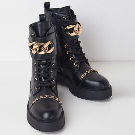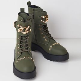 Μποτάκι από συνθετικό δέρμα με καπιτονέ σχέδιο και διακοσμητική αλυσίδα. Στρογγυλή μύτη. Chuncky τρακτερωτή σόλα με ανάγλυφο σχέδιο. Δένει με κορδόνι. Συνολικό ύψος : 21,5 εκ. Ύψος σόλας : 4 εκ.