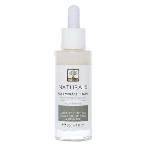 Bioselect naturals αντιγηραντικός ορός περιποίησης για πρόσωπο και λαιμό με Βιολογικό Ελαιόλαδο, Εκχύλισμα Φύλλων Ελιάς και Λαδιού κάνναβης.