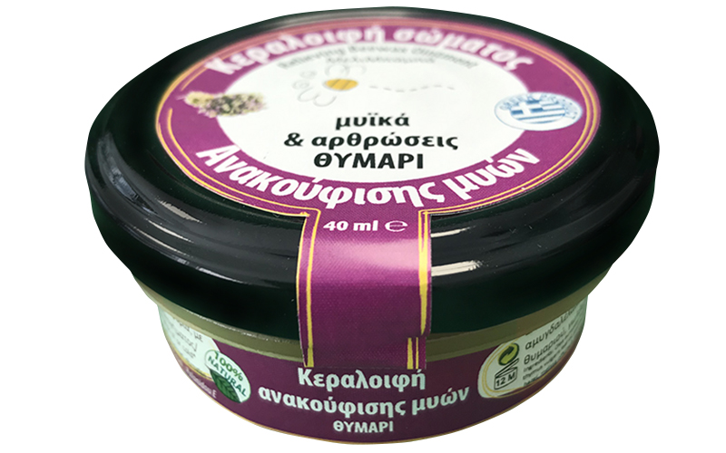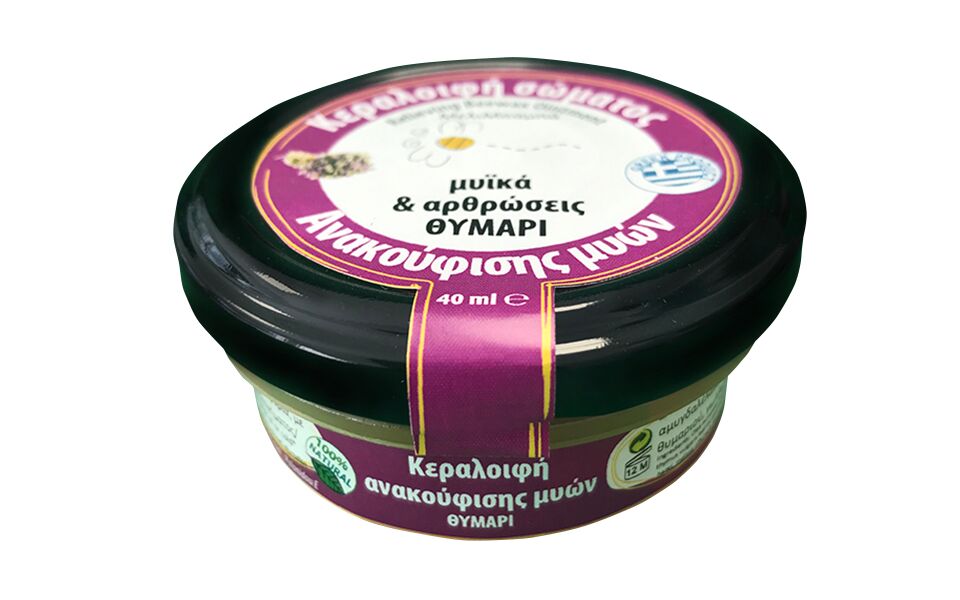 Η κηραλοιφή ως φυσικό καλλυντικό αντιμετωπίζει και ανακουφίζει από ρευματικούς, αρθριτικούς, μυϊκούς, κρυολογήματος και άλλους πόνους και συμβάλει στην βελτίωση της λειτουργίας των αρθρώσεων, για ασφαλή χρήση και από υπερτατασικούςRelieving muscles Beewax OintmentTreats and relieves rheumatism, arthritis, muscle, colds and other pains and contributes to improve the functioning of the jointsIngredients: Olea europaea fruit oil, cera alba, prunus amygdalus dulcis oil, gaultheria procumbens leaf oil, thymus vulgaris leaf oil, indian melisse leaf oil