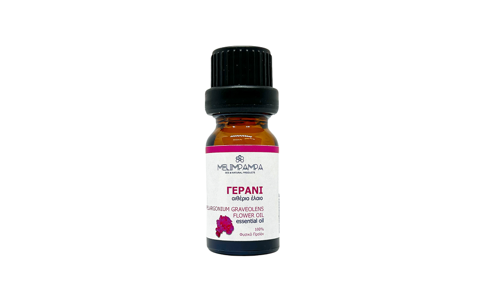 Το αιθέριο έλαιο Γεράνι (Pelargonium Graveolens Flower Oil) προέρχεται από απόσταξη των λουλουδιών και των φύλλων του φυτού και έχει ένα ζωντανό, λουλουδάτο άρωμα.Είναι ισχυρές αντισηπτικές, αντιμικροβιακές και επουλωτικές ιδιότητες και είναι από τους μεγαλύτερους συμμάχους για την περιποίηση του δέρματος.Βοηθά σημαντικά στη διαδικασία επούλωσης του δέρματος: Πληγές, κοψίματα, ουλές και σημάδια ακμής με τη χρήση του ελαίου, ξεθωριάζουν και εξαφανίζονται, αφού βοηθά την κυκλοφορία του αίματος κάτω από την επιφάνεια του δέρματος και προωθεί την ομοιόμορφη διανομή της μελανίνης. Επίσης το γεράνι βοηθά στην αντιμετώπιση διάφορων δερματολογικών παθήσεων όπως ακμή, στίγματα, δερματίτιδα και έκζεμα.Επιπλέον είναι ιδανικό για την περιποίηση της επιδερμίδας του προσώπου και του σώματος. Είναι κατάλληλο για όλους τους τύπους δέρματος ακόμα και για τους πιο ευαίσθητους, αφού ενυδατώνει σε βάθος και ρυθμίζει τη λιπαρότητα ενώ παράλληλα προσφέρει και αντιγηραντική δράση. Με μασάζ στο σώμα τονώνει την κυκλοφορία του αίματος και βοηθά στην αντιμετώπιση της κυτταρίτιδας και της πρόωρης χαλάρωσης.Επίσης είναι εξαιρετικό για την περιποίηση των ξηρών αλλά και λιπαρών μαλλιών. Μπορεί να εξισορροπήσει τη λιπαρότητα του τριχωτού της κεφαλής και των μαλλιών αφήνοντας τα υγιή και απαλά. Ταυτόχρονα τα θρέφει σε βάθος και βοηθά στη γρήγορη ανάπτυξή τους.Τέλος όταν εξατμίζεται στο χώρο έχει εντομοαπωθητική δράση, βοηθά στη μείωση του στρες και τη συναισθηματική ισορροπία.Μπορείτε να το χρησιμοποιήσετε για να αρωματίσετε δωμάτια, τουαλέτα, ντουλάπες, συρτάρια, αυτοκίνητο ή για άλλες χρήσεις αρωματισμού προϊόντων. Μπορείτε να ρίξετε μερικές σταγόνες σε νερό και να το αφήσετε να εξατμιστεί ή να το τοποθετήσετε σε συσκευή ρεσό πάνω από κεράκι. Μπορείτε ακόμη να εμποτίσετε σκληρό χαρτόνι, να το τοποθετήσετε σε διάφορα σημεία και να απολαμβάνετε οικονομικά το υπέροχο άρωμα του, ανανεώνοντας όσο συχνά θέλετε.Διατίθεται με πρακτικό σταγονόμετρο σε σκουρόχρωμο φαρμακευτικό φιαλίδιο με καπάκι ασφαλείας.10ml