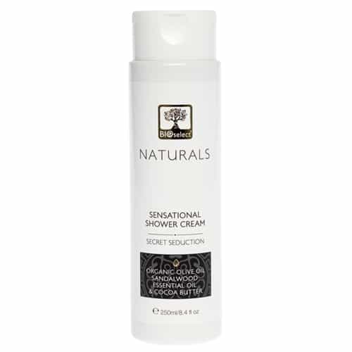 Bioselect naturals απαλό κρεμώδες αφρόλουτρο secret seduction με βιολογικό λάδι ελιάς, αιθέριο έλαιο σανταλόξυλου και βούτυρο κακάο.