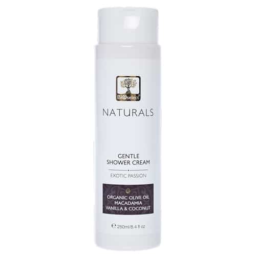 Bioselect naturals απαλό κρεμώδες αφρόλουτρο exotic passion με βιολογικό λάδι ελιάς, μακαντέμια, βανίλια και καρύδα.