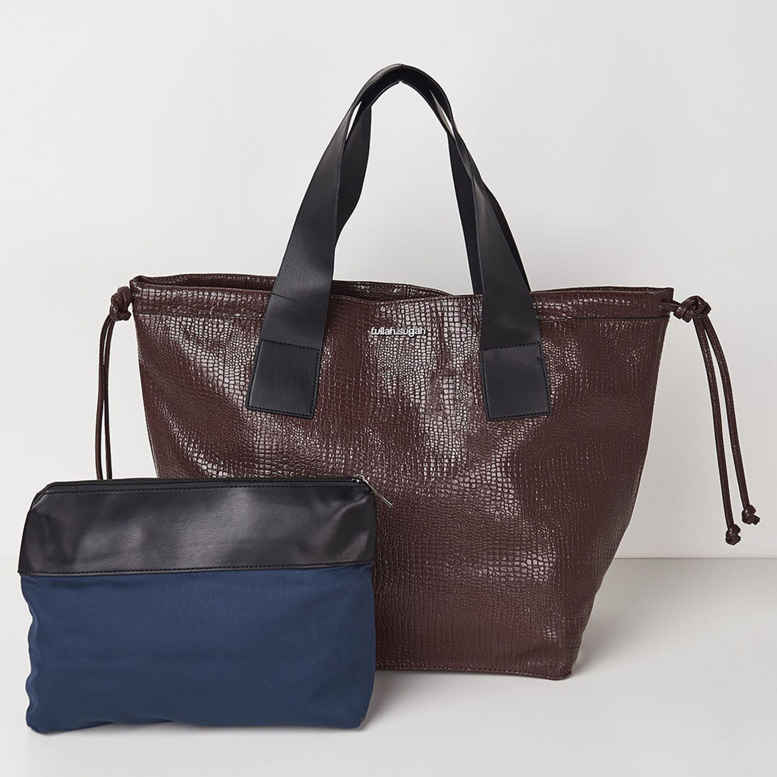 Τσάντα shopper σε μεγάλο μέγεθος με ανάγλυφη υφή φιδιού. Πλατιοί ιμάντες σε χρωματική αντίθεση. Ενιαίος εσωτερικός χώρος. Κλείνει με φερμουάρ και πλαϊνά κορδόνια που σουρώνουν. Διαθέτει έξτρα νεσεσέρ. ΠΧΒΧΥ : 53X19X36.