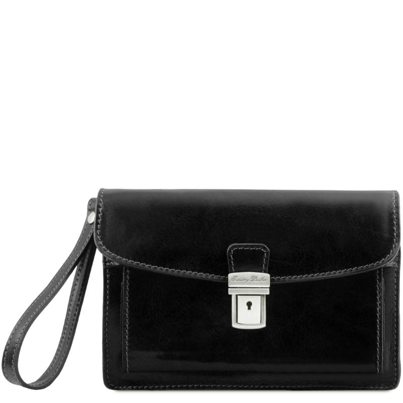TypeWristlet BagΣύστασηFull grain hand stained vegetable tanned leatherΕσωτερικό δέρμαΑξεσουάρΘήκη αποθήκευσηςΕσωτερικό μέροςΘήκες για πιστωτικές κάρτεςΛαβές Αποσπώμενη λαβήΧαρακτηριστικάΆκαμπτης κατασκευής2 εσωτερικά διαμερίσματαΕξωτερικό μέροςΜπροστινή θήκη κλειστού τύπουΕξωτερική θήκη στην πίσω πλευρά με φερμουάρΚλείσιμοPush-lock clasp with key