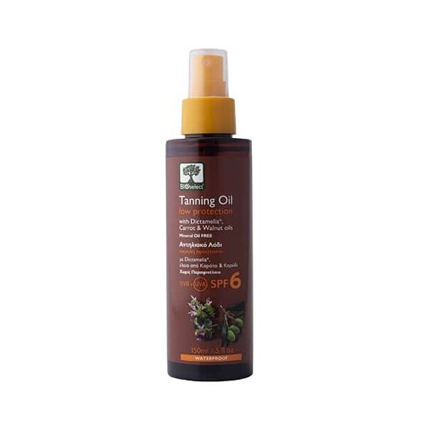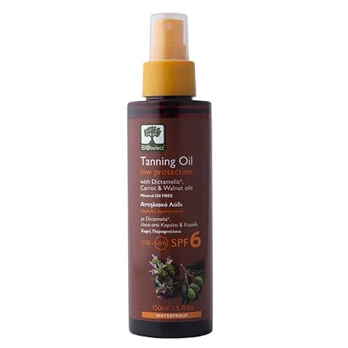 Bioselect organic αντηλιακό λάδι χαμηλής προστασίας SPF 6 με Dictamelia, έλαια καρότου και καρυδιού
