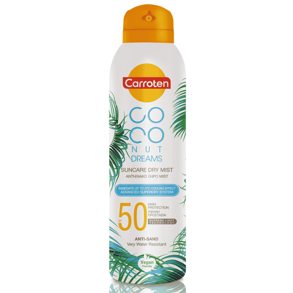 Carroten αντηλιακό dry mist, Coconut Dreams SPF 50, προσφέρει υψηλή προστασία, άμεση απορρόφηση και μοναδικό, αόρατο, ξηρό τελείωμα εξαιτίας του συστήματος Superdry. Προσφέρει άμεση αίσθηση δροσιάς έως και -2°C για αναζωογόνηση της επιδερμίδας. Επίσης, το 360° σύστημα ψεκασμού παρέχει εύκολη εφαρμογή υπό κάθε κλίση.