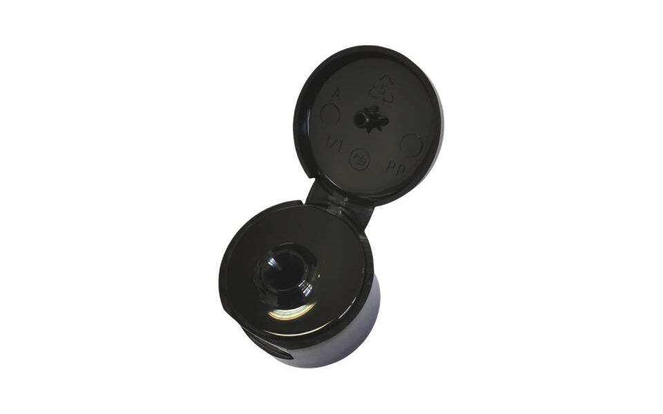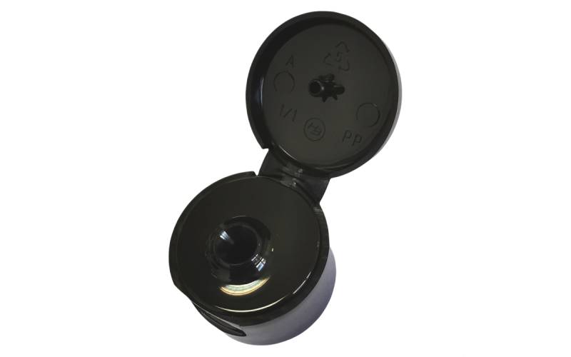 Πώμα flip top σε μαύρο χρώμα που μπορεί να χρησιμοποιηθεί για παχύρρευστα προϊόντα, όπως σαμπουάν, αφρόλουτρο, scrub και άλλα.Δε λερώνει, δε στάζει και είναι εύκολο στη χρήση.Συνδυάζεται με PET μπουκάλια τύπου PP24.Βάρος: 40 gr