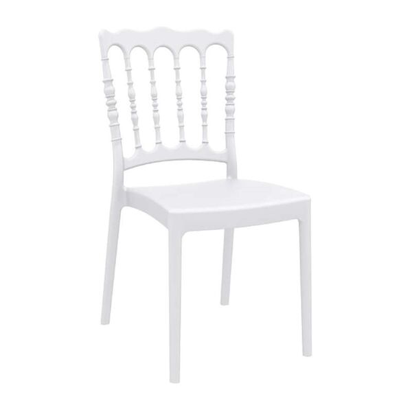 Καρέκλα NAPOLEON του οίκου Siesta σε λευκό χρώμα, κατασκευασμένη από πολυπροπυλένιο με 20% fiber glass για απόλυτη αντοχή στο χρόνο.Κατάλληλη για εσωτερική και εξωτερική χρήση,στοιβαζόμενη,ιδανική επιλογή και για χώρους δεξιώσεων.Πιστοποιημένο προϊόν από τον Ιταλικό οίκο CATAS.