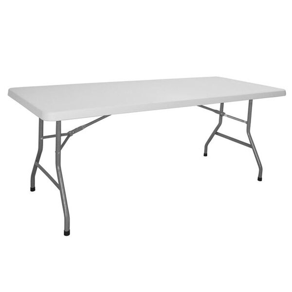Τραπέζι catering μονοκόμματο ορθογώνιο από ενισχυμένο πρωτογενές πλαστικό και μεταλλικό σκελετό για εύκολη και ασφαλή μεταφορά. Διαθέτει επιφάνεια από πρωτογενές HDPE (Υψηλής πυκνότητας πολυαιθυλαίνιο) και ενισχυμένη μεταλλική βάση ηλεκτροστατικής βαφής. Διαστάσεις: 183x76x74 εκ. Πάχος επιφάνειας: 4,5 εκ. Χρώμα επιφάνειας: Λευκό Σκελετός: Μεταλλικός βαμμένος με ηλεκτροστατική βαφή σε γκρι χρώμα διαμέτρου φ28mm και πάχους 1mm Βάρος: Καθαρό 14.00kgr - μικτό 15.00kgr.