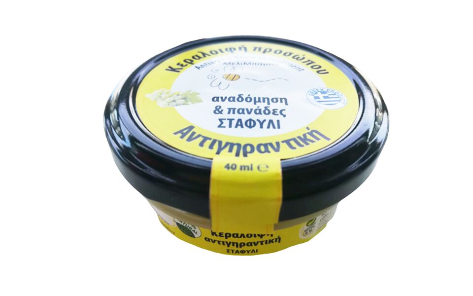 Η κηραλοιφή ως φυσικό καλλυντικό βοηθά και συντελεί στη σύσφιξη, αναδόμηση, τόνωση, ελαστικότητα του προσώπου, αντιμετωπίζει και αποτρέπει την δημιουργία ακμής και πανάδων, με αντιοξειδωτικές και αντηλιακές ιδιότητες. Ήπια λιπαρή ύφή, για όλους τους τύπους δέρματοςANTIAGING Beewax Ointment - 40ml Ηelps and contributes to the strengthening, restructuring, toning, elasticity of the face, treats and prevents the creation of acne and blotches, with antioxidant and sunscreen properties. For all skin types.Ingredients: Vitis vinifera seed oil, donkey milk organic, prunus amygdalus dulcis oil, sesamum indicum seed oil, cucumis sativus fruit extract water,beewax white pellets, cera alba, simmondsia chinensis seed oil (jojoba oil)organic, potassium palmitoyl hydrolyzed wheat protein glyceryl stearate cetearyl alcohol, cetearyl alcohol PEG20 stearate, Jasminia s.af frag.,benzyl alcohol, dehydroacetic acid, tinctura propolis