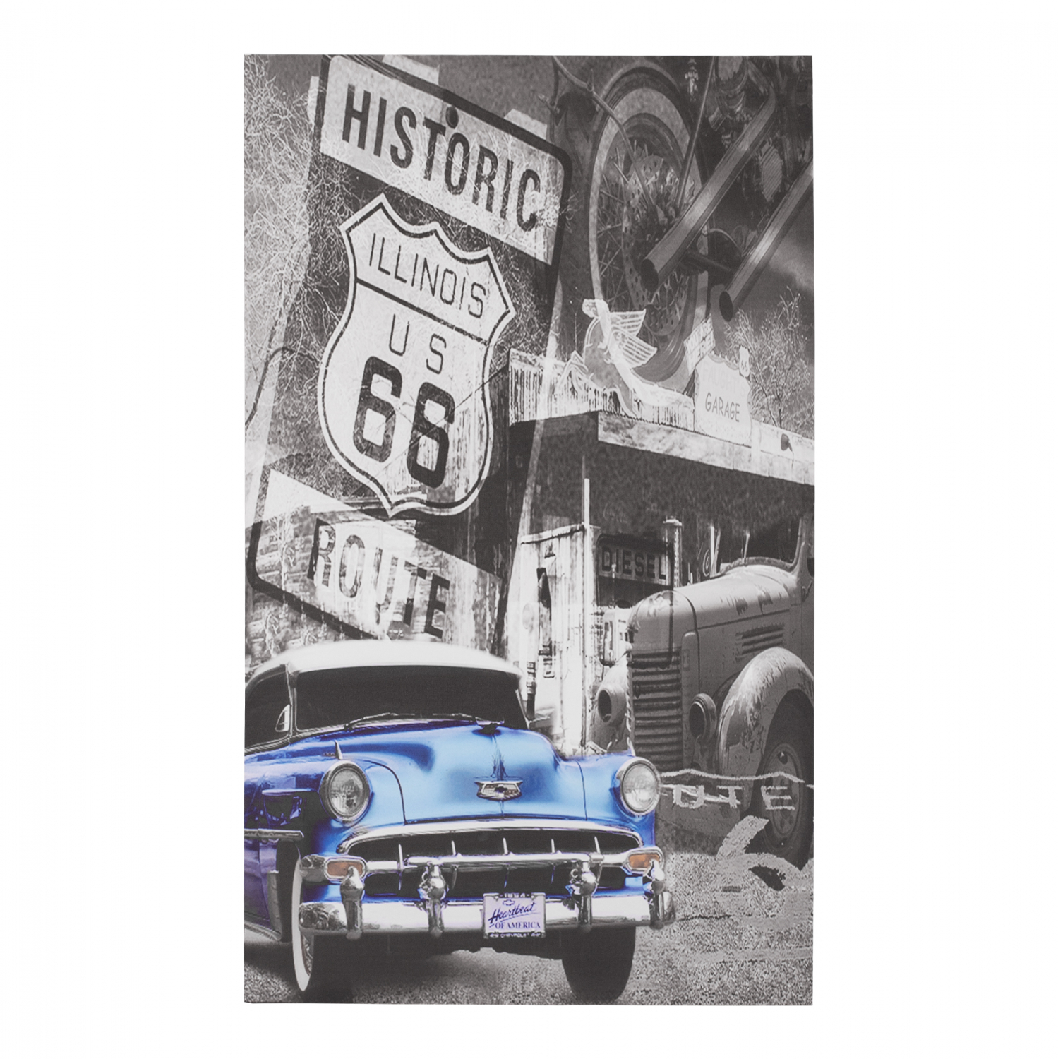 Οι διακοσμητικοί πίνακες δίνουν μια άλλη προοτική στον χώρο μας και αναδεικνύουν τους τοίχους στους οποίους τοποθετούνται. Κλασσικοί ή μοντέρνοι, σε ξύλο ή σε καμβά, αλλάζουν το σπίτι μας και την διάθεσή μας. Διακοσμητικός πίνακας σε τυπωμένο καμβά σε σχέδιο Route 66 Car. Διαστάσεις: 70x120 εκ. Πάχος: 2,5 εκ.