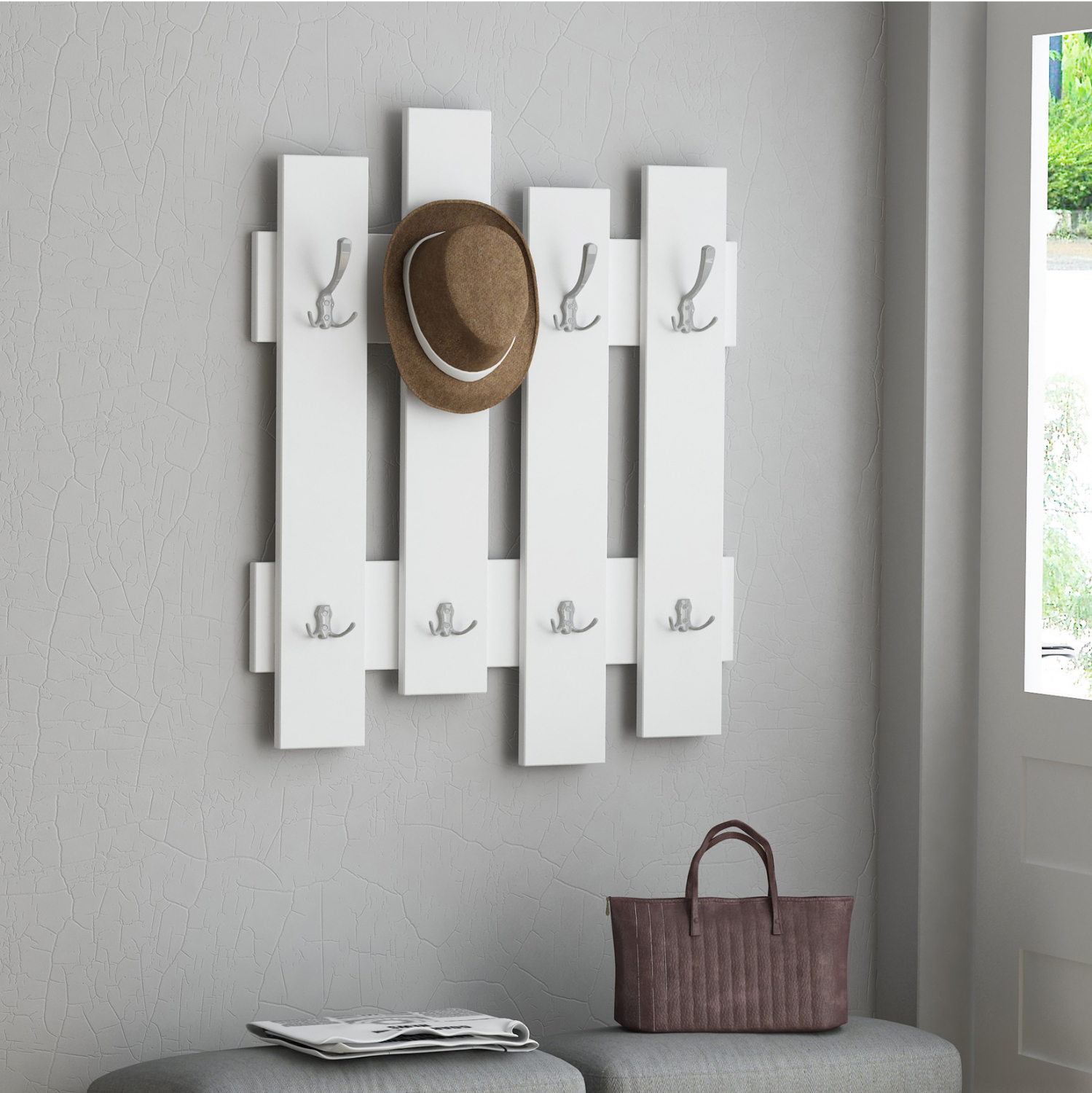 Κρεμάστρα εισόδου με λιτό σχεδιασμό, κατασκευασμένο από ανθεκτική μελαμίνη πάχους 18 χιλιοστών, σε λευκή απόχρωση. Δημιουργήσετε έναν καλά οργανωμένο και τακτοποιημένο χώρο στην είσοδο του σπιτιού σας. Τα έπιπλα εισόδου καταλαμβάνουν λιγότερο χώρο και αποτελούν μία πρακτική πρόταση διακόσμησης για τον χώρο υποδοχής του σπιτιού σας. Διαστάσεις κρεμάστρας: 64x4x79 εκ. Ευρωπαϊκής κατασκευής και προέλευσης. Το προϊόν διατίθεται αμοντάριστο σε εργοστασιακή συσκευασία.