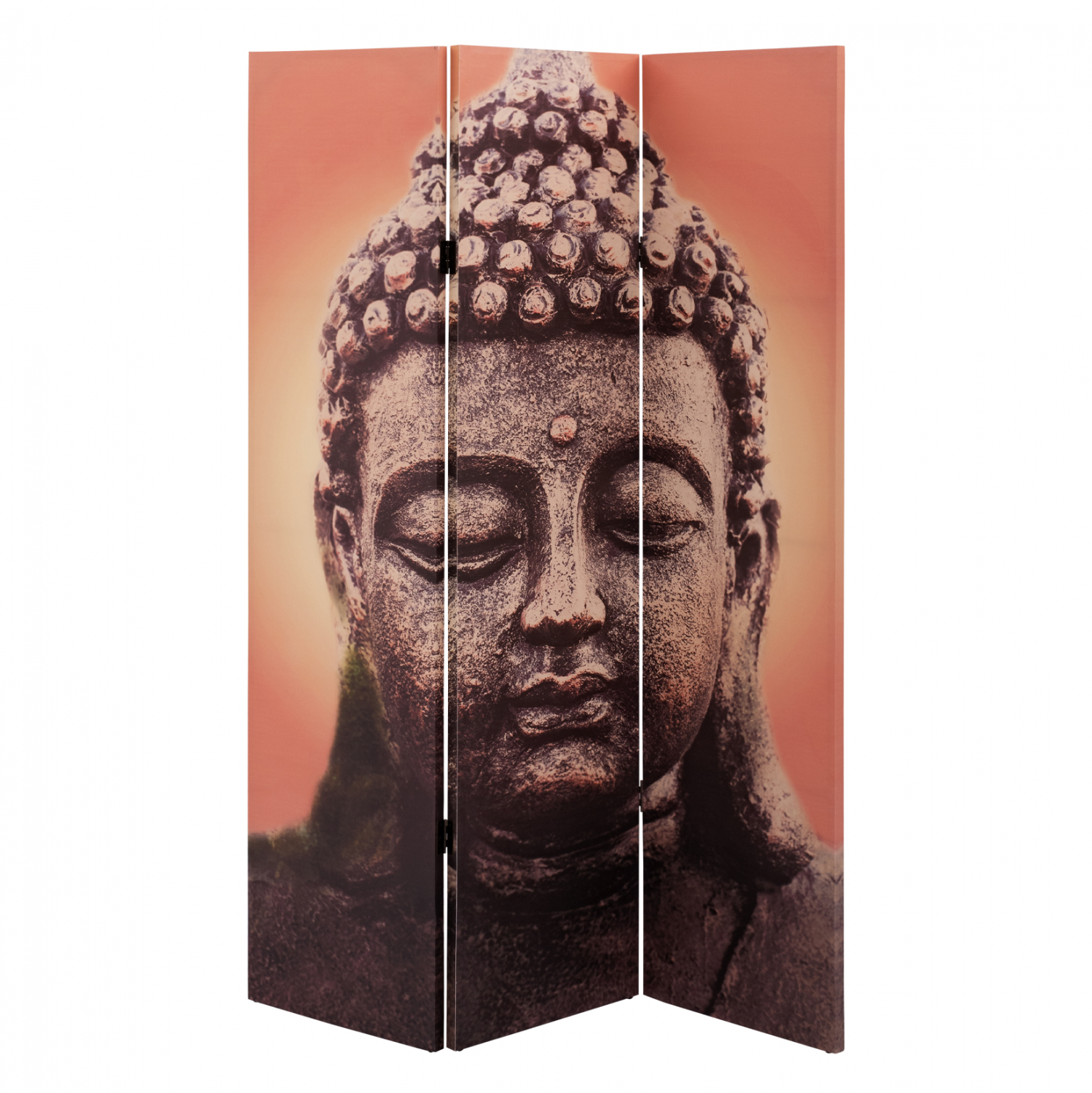 Διακοσμητικό παραβάν διπλής όψης από τυπωμένο καμβά, με τρία φύλλα σε σχέδιο Buddha. Χρησιμοποιήστε το στο χώρο σας και στολίστε ή κρύψτε κάτι στο σπίτι σας με τον πιο όμορφο τρόπο. Σχέδιο: Buddha Διαστάσεις: 180x121x2,5 εκ.