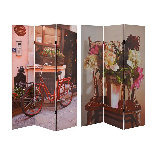 Διακοσμητικό παραβάν διπλής όψης από τυπωμένο καμβά, με τρία φύλλα σε σχέδιο Bike and chair. Χρησιμοποιήστε το στο χώρο σας και στολίστε ή κρύψτε κάτι στο σπίτι σας με τον πιο όμορφο τρόπο. Σχέδιο: Bike and chair Διαστάσεις: 180x121x2.5 εκ