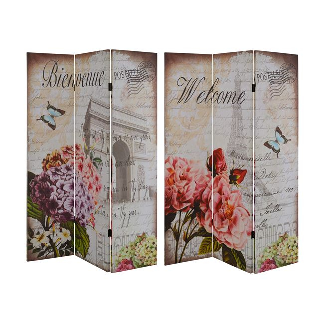 Διακοσμητικό παραβάν διπλής όψης από τυπωμένο καμβά, με τρία φύλλα σε σχέδιο Welcome. Χρησιμοποιήστε το στο χώρο σας και στολίστε ή κρύψτε κάτι στο σπίτι σας με τον πιο όμορφο τρόπο. Σχέδιο: Welcome Διαστάσεις: 180x121x2.5 εκ