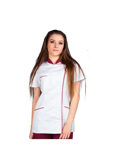 Sintia Tunic White Bordeaux . Γυναικεία κοντομάνικη μπλούζα, κομψή και πρακτική, κατάλληλη για επάγγελμα ιατρικής, φαρμακευτικής, αισθητικής. Από εξαιρετικής ποιότητα ποπλίνα σε 65%πολυέστερ 35%βαμβάκι 160-170 gr / m 2, ανεκτική σε πλύσιμο υψηλής θερμοκρασίας, δεν τσαλακώνει. Με κοντράστ μάο γιακά. Μπροστινό κλείσιμο στο πλάι με κρυφά τρουκς. Κοντράστ φυτίλι λεπτομέρεια στο ύψος της πατιλέτας και τσέπες. Δύο μπροστινές τσέπες και μία μικρότερη στήθους. Χρώμα : Λευκό-Μπορντό .