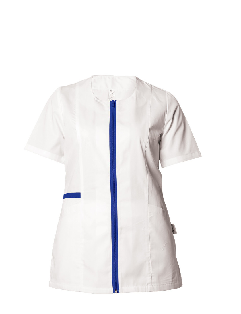 Zaira Tunic White Blue. Γυναικεία κοντομάνικη μπλούζα-τουνίκ με κοντράστ φερμουάρ. Με ωραία εφαρμογή, πρακτική και κατάλληλη για επάγγελμα ιατρικής, αισθητικής, σπα και φαρμακείου. Από εξαιρετική ποιότητα ποπλίνα σε 65%πολυέστερ 35%βαμβάκι 160-170 gr / m 2, ανεκτική σε πλύσιμο υψηλής θερμοκρασίας, δεν τσαλακώνει, αναπνέον ύφασμα. Στρογγυλή λαιμόκοψη με εσωτερική μόστρα. Κοντράστ χρώμα σε φερμουάρ και λεπτομέρεια τσέπης. Δύο μπροστινές τσέπες. Πλαϊνά σχισίματα. Συνδυάζεται με λευκό ή χρωματιστό παντελόνι Barisa . Χρώμα: Λευκό-Μπλέ.