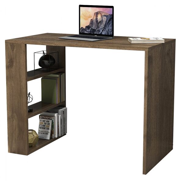Γραφείο με κομψό και λιτό σχεδιασμό, κατασκευασμένο από ανθεκτική μελαμίνη πάχους 18 χιλιοστών υψηλής ποιότητας, σε καρυδί απόχρωση. Πρωτοποριακό design που συνδυάζει την αισθητική με την χρηστικότητα προσφέροντας έναν άνετο χώρο εργασίας και αποθήκευσης βιβλίων και μικροαντικειμένων. Επιφάνεια εργασίας από μελαμίνη σε καρυδί χρώμα, με 3 ράφια στο αριστερό μέρος του γραφείου. Διαστάσεις: 90Χ50Χ70Υεκ. Ευρωπαϊκής κατασκευής και προέλευσης. Το προϊόν διατίθεται αμοντάριστο σε εργοστασιακή συσκευασία.