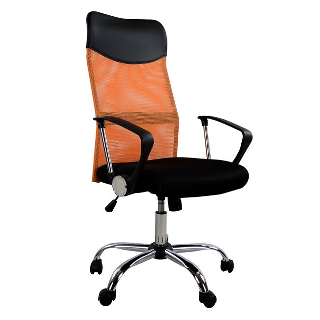 Καρέκλα γραφείου με μπράτσα από μαύρη πολυκαρβονική επιφάνεια, με ψηλή πλάτη για να στηρίζει όλο το σώμα και διάτρητο ύφασμα σε πορτοκαλί χρώμα για να ταιριάζει στον χώρο σας. Η πλάτη της καρέκλας είναι από ύφασμα mesh για να αφήνει την πλάτη να αναπνέει και να μην ιδρώνει, επίσης έχει ενσωματωμένο μαξιλαράκι για το κεφάλι από PU υλικό σε μαύρο χρώμα. Διαθέτει inox πόδι για αξεπέραστη αντοχή. Υψηλό design για εσάς που θέλετε ο χώρος να ξεχωρίζει. Στηρίζει και ξεκουράζει τους μυς που στηρίζουν την σπονδυλική στήλη. Ιδανική για μαθητές, φοιτητές και για επαγγελματικούς χώρους. Διαστάσεις: 61x58x118Y εκ. Min ύψος καρέκλας: 108 εκ. Max ύψος καρέκλας: 118 εκ. Min ύψος καθίσματος: 45 εκ. Max ύψος καθίσματος: 55 εκ. Min ύψος μπράτσων: 62 εκ. Max ύψος μπράτσων: 72 εκ. Διαστάσεις καθίσματος: 50x50 εκ. Διαστάσεις μπράτσων: 34x5,5x19 εκ. Ύψος πλάτης: 67 εκ. Η καρέκλα διατίθεται σε πακέτο με αναλυτικές οδηγίες συναρμολόγησης με εικόνες.