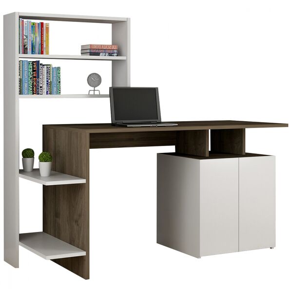 Γραφείο βιβλιοθήκη με κομψό και λιτό σχεδιασμό, κατασκευασμένο από ανθεκτική μελαμίνη πάχους 18 χιλιοστών υψηλής ποιότητας, σε λευκή απόχρωση με λεπτομέρειες σε καρυδί χρώμα. Έχει πολύ πρωτοποριακό design που συνδυάζει την αισθητική με την χρηστικότητα προσφέροντας έναν άνετο χώρο εργασίας και αποθήκευσης βιβλίων και μικροαντικειμένων. Διαθέτει μια επιφάνεια εργασίας από μελαμίνη σε καρυδί χρώμα, μια βιβλιοθήκη - ραφιέρα στην αριστερή πλευρά σε λευκή απόχρωση και ένα ντουλάπι με ένα ευρύχωρο ράφι στην δεξιά πλευρά του γραφείου σε λευκό χρώμα. Διαστάσεις: 146,3x60x128,8 εκ. Ύψος επιφάνειας εργασίας: 73,8 εκ. Διαστάσεις βιβλιοθήκης: 63,6x14,5x128,8 εκ. Ευρωπαϊκής κατασκευής και προέλευσης. Το προϊόν διατίθεται αμοντάριστο σε εργοστασιακή συσκευασία.