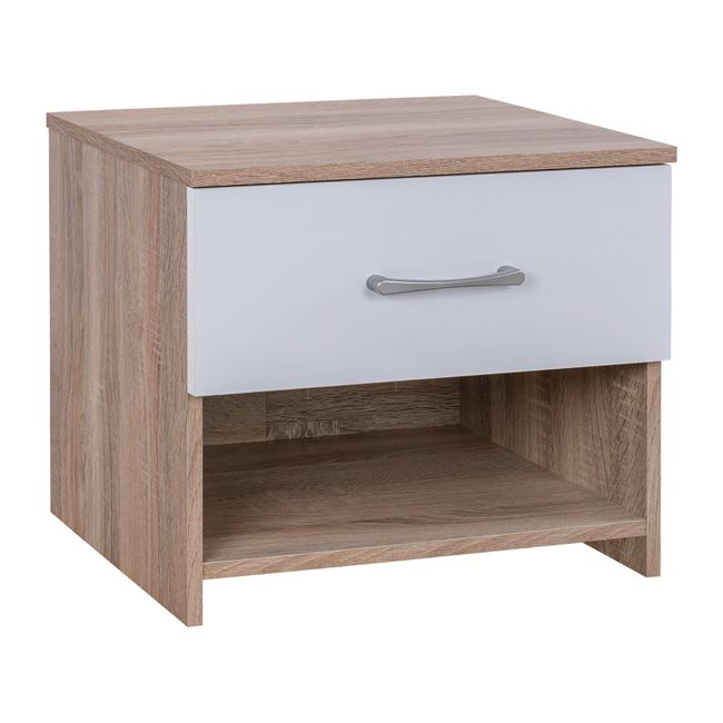Μοντέρνο κομοδίνο κατασκευασμένο από μελαμίνη, σε sonama απόχρωση με λευκές λεπτομέρειες. Διαθέτει ένα συρτάρι και ένα ειδικά διαμορφωμένο ράφι για να τοποθετήσετε τα βιβλία ή τα διακοσμητικά σας. Δώστε μοντέρνο στιλ στο σπίτι σας και αφήστε όλους τους άλλους άφωνους. Διαστάσεις: 50x35x42Y εκ. Το προϊόν διατίθεται αμοντάριστο σε πακέτο.