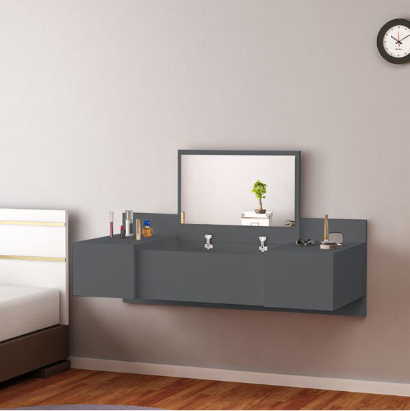 Κρεμαστή τουαλέτα με καθρέπτη με λιτό σχεδιασμό σε ανθρακί απόχρωση. Διαθέτει ένα κεντρικό μεγάλο ντουλάπι με εσωτερικό καθρέπτη και δυο μικρότερα ντουλάπια δεξιά και αριστερά. Κατσκευασμένο από μελαμίνη υψηλής ποιότητας πάχους 18mm. Ένα ιδιαίτερα χρήσιμο έπιπλο για την κρεβατοκάμαρά σας, που θα εντυπωσιάσει και τους πιο δύσκολους. Διαστάσεις: 100x39x33Y εκ. Ευρωπαϊκής κατασκευής και προέλευσης. Το προϊόν διατίθεται αμοντάριστο σε εργοστασιακή συσκευασία.