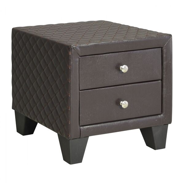 Κομοδίνο Elda επενδεδυμένο από τεχνόδερμα, σε καφέ απόχρωση. Το τεχνόδερμα σε καφέ απόχρωση, αποτελεί μια διαχρονική λύση στην διακόσμηση της κρεβατοκάμαρας σας. Το κομοδίνο διαθέτει 2 συρτάρια αποθήκευσης. Διαστάσεις: 45x39x45Υ εκ.