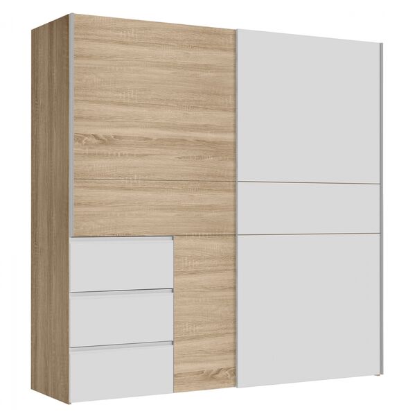 Συρόμενη ντουλάπα με δύο πόρτες και 3 συρτάρια, σε sonama και λευκή απόχρωση. Κατασκευασμένη από μελαμίνη υψηλής ποιότητας. Διαθέτει δύο συρόμενες πόρτες με φρένα ασφαλείας για μεγαλύτερη εξοικονόμηση χώρου. Στο εσωτερικό της ντουλάπας, υπάρχουν 2 χώροι αποθήκευσης με 2 μεταλλικά δοκάρια ειδικά κατασκευασμένα για κρέμαση ρούχων. Επίσης διαθέτει 3 ευρύχωρα συρτάρια. Συνδυάζει την ποιότητα κατασκευής με την εργονομία και την πρακτικότητα που χρειάζεται κάθε σπίτι. Είναι σχεδιασμένη με μια ιδιαίτερη φινέτσα ώστε να μπορεί να τοποθετηθεί σε κάθε χώρο του σπιτιού σας. Διαστάσεις: 170x62x201Υ εκ. Ευρωπαϊκής κατασκευής Παρατηρήσεις: Το προϊόν παραδίδεται αμοντάριστο, σε εργοστασιακή συσκευασία με αναλυτικές οδηγίες συναρμολόγησης. Συνιστάται η συναρμολόγηση της ντουλάπας, να πραγματοποιηθεί από εξειδικευμένο τεχνικό συνεργείο.