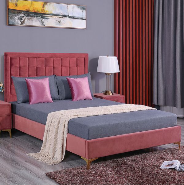 Το κρεβάτι MONTPELLIER θα δώσει στην κρεβατοκάμαρά σας ένα άγγιγμα κομψότητας. Είναι επενδεδυμένο από βελούδο υψηλής ποιότητας σε απόχρωση σάπιο μήλο και μεταλλικά επίχρυσα πόδια. Το ελαφρώς λαμπερό ύφασμα με την αδιαμφισβήτητη εμφάνιση και αίσθηση δεν είναι χωρίς λόγο μια από τις ζωντανές τάσεις κατ 'εξοχήν. Ένα κρεβάτι μοντέρνου και λιτού σχεδιασμού, με επιπλέον μαξιλάρι στο κεφαλάρι θα σας χαρίσει περισσότερη άνεση κατά τις ώρες ξεκούρασης. Διαστάσεις στρώματος: 150x200 εκ. Εξωτερικές διαστάσεις 158Χ212 Στη συσκευασία συμπεριλαμβάνονται και οι τάβλες στήριξης του στρώματος. Το στρώμα δεν συμπεριλαμβάνεται.