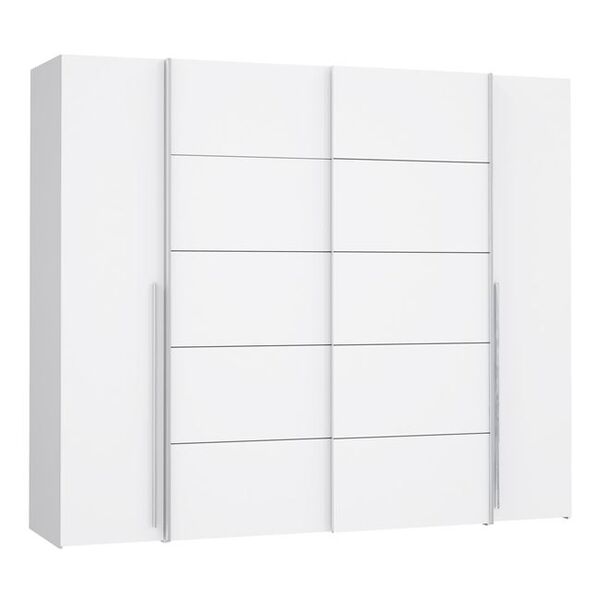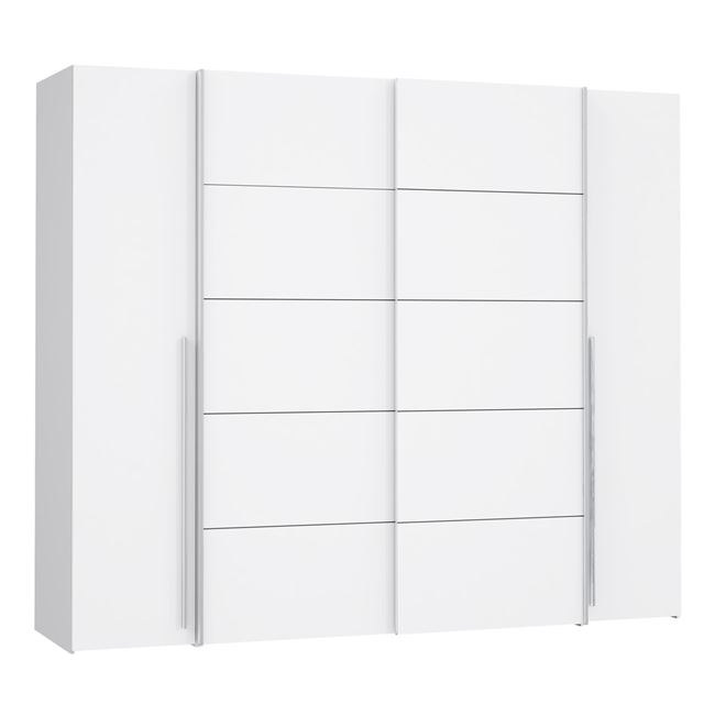 Συρόμενη ντουλάπα 4φυλλη, σε λευκή απόχρωση. Κατασκευασμένη από μελαμίνη υψηλής ποιότητας. Διαθέτει δύο συρόμενες πόρτες με φρένα ασφαλείας για μεγαλύτερη εξοικονόμηση χώρου και 2 ανοιγόμενες. Στην αριστερή και δεξιά πλευρά του εσωτερικού της ντουλάπας, υπάρχουν τέσσερα ράφια ( πέντε χώροι αποθήκευσης ) για κάθε πλευρά. Στην μεσαία πλευρά του εσωτερικού της ντουλάπας, υπάρχουν 2 χώροι αποθήκευσης με 2 μεταλλικά δοκάρια ειδικά κατασκευασμένα για κρέμαση ρούχων. Συνδυάζει την ποιότητα κατασκευής με την εργονομία και την πρακτικότητα που χρειάζεται κάθε σπίτι. Είναι σχεδιασμένη με μια ιδιαίτερη φινέτσα ώστε να μπορεί να τοποθετηθεί σε κάθε χώρο του σπιτιού σας. Διαστάσεις: 271x62x210Υ εκ. Ευρωπαϊκής κατασκευής Παρατηρήσεις: Το προϊόν παραδίδεται αμοντάριστο, σε εργοστασιακή συσκευασία με αναλυτικές οδηγίες συναρμολόγησης. Συνιστάται η συναρμολόγηση της ντουλάπας, να πραγματοποιηθεί από εξειδικευμένο τεχνικό συνεργείο.