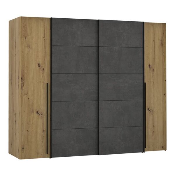 Συρόμενη ντουλάπα 4φυλλη, σε artisan oak και γκρι cement απόχρωση. Κατασκευασμένη από μελαμίνη υψηλής ποιότητας. Διαθέτει δύο συρόμενες πόρτες με φρένα ασφαλείας για μεγαλύτερη εξοικονόμηση χώρου και 2 ανοιγόμενες. Στην αριστερή και δεξιά πλευρά του εσωτερικού της ντουλάπας, υπάρχουν τέσσερα ράφια ( πέντε χώροι αποθήκευσης ) για κάθε πλευρά. Στην μεσαία πλευρά του εσωτερικού της ντουλάπας, υπάρχουν 2 χώροι αποθήκευσης με 2 μεταλλικά δοκάρια ειδικά κατασκευασμένα για κρέμαση ρούχων. Συνδυάζει την ποιότητα κατασκευής με την εργονομία και την πρακτικότητα που χρειάζεται κάθε σπίτι. Είναι σχεδιασμένη με μια ιδιαίτερη φινέτσα ώστε να μπορεί να τοποθετηθεί σε κάθε χώρο του σπιτιού σας. Διαστάσεις: 271x62x210Υ εκ. Ευρωπαϊκής κατασκευής Παρατηρήσεις: Το προϊόν παραδίδεται αμοντάριστο, σε εργοστασιακή συσκευασία με αναλυτικές οδηγίες συναρμολόγησης. Συνιστάται η συναρμολόγηση της ντουλάπας, να πραγματοποιηθεί από εξειδικευμένο τεχνικό συνεργείο.