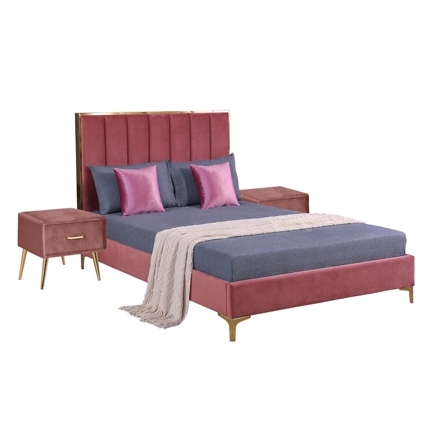 Σετ κρεβατοκάμαρας, από βελούδο σε απόχρωση σάπιο μήλο με μεταλλικές λεπτομέρειες σε χρυσή απόχρωση. Το σετ 3τμχ περιέχει ένα κρεβάτι και δυο κομοδίνα. Κωδ. HM590.02 Διαστάσεις υπέρδιπλου κρεβατιού Στρώματος: 160x200 εκ. Κωδ. HM593.02 Διαστάσεις κομοδίνου: 45x36x41Υ εκ.